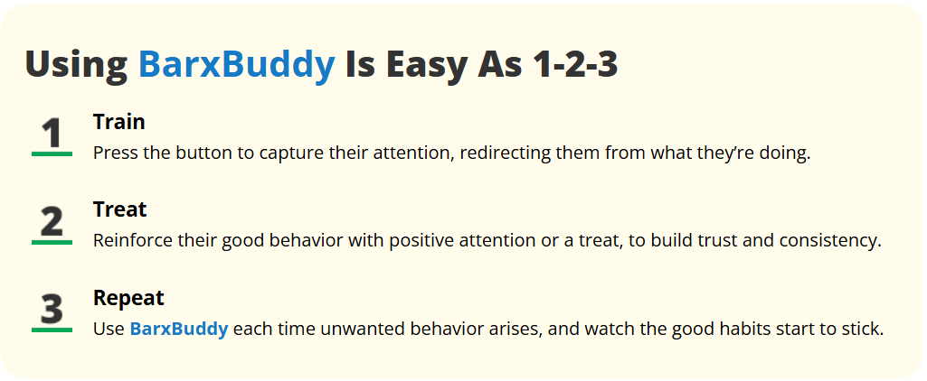 We stand by BarxBuddy with a 30-day money-back guarantee. If it doesn’t work for your dog, simply return it for a refund—no risk, all reward.